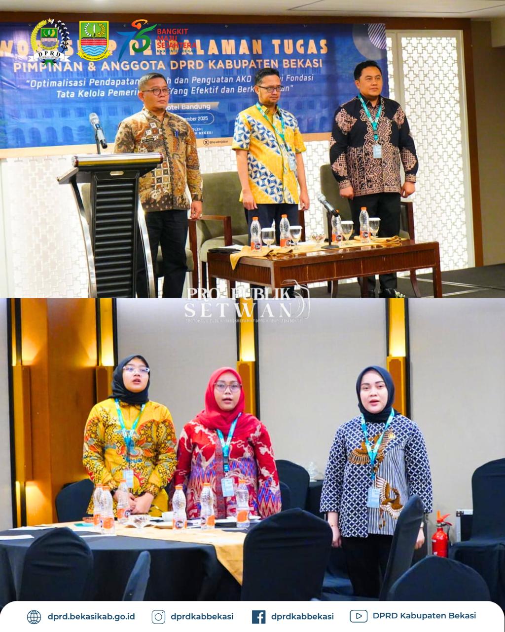 Dewan Perwakilan Rakyat Daerah (DPRD) Kabupaten Bekasi menyelenggarakan kegiatan Bimbingan Teknis (Bimtek) Pendalaman Tugas bagi Pimpinan dan Anggota DPRD Kabupaten Bekasi sebagai upaya peningkatan kapasitas, kompetensi, dan profesionalisme dalam menjalankan fungsi legislasi, penganggaran, dan pengawasan, Kota Bandung (14/12/2025).